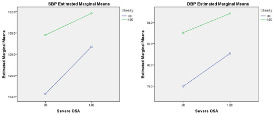 After adjusting for gender, age, glucose level, smoking, and drinking, the strong main effects of severe OSA were detected in SBP (F = 5.416, p = 0.020) and DBP (F = 5.686, p = 0.017). Furthermore, after adjusting for the multiple confounding factors described above, the strong main effects of obesity were detected in SBP (F = 9.652, p = 0.002) and DBP (F = 18.144, p < 0.001; see Table 2). No effects from interactions between severe OSA and obesity on SBP (F = 0.764, p = 0.382) or DBP (F = 0.418, p = 0.518) were found (see Table 2 and Figure 3).
