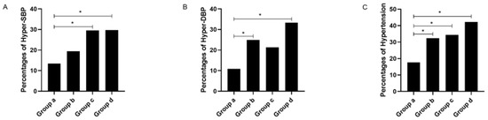 Percentages of abnormal blood pressure stratified by obesity and severe OSA. Footnote: Group a, non-obese with non-severe OSA group; Group b, non-obese with severe OSA group; Group c, obese with non-severe OSA group; Group d, obese with severe OSA group; subfigure (A), comparison of percentages of hyper-SBP among the four gruops; subfigure (B), comparison of percentages of hyper-DBP among the four groups; subfigure (C), comparison of percentages of hypertension among the four groups; *, p < 0.05. Abbreviations: OSA, obstructive sleep apnea; SBP, systolic blood pressure; DBP, diastolic blood pressure.