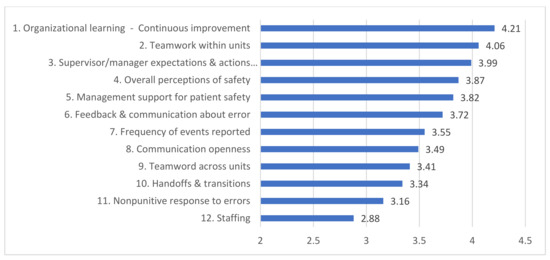 On the one hand, the results of this study showed that the overall perception of safety culture is good (3.87 ± 0.76) compared to that of France (3.21) and Austria (3.68) [18,19]. On the other hand, the perception of nonpunitive response to errors obtained lowest scores. For example, in France, it scored the lowest (2.94) [18]. Similarly, a study from the Czech Republic found that there was a higher frequency of reported events in cases in which feedback and communication about errors were accepted and organizational learning and continuous improvement were ensured [20]. This finding is also supported by our results, in which feedback and communication about errors showed high scores.