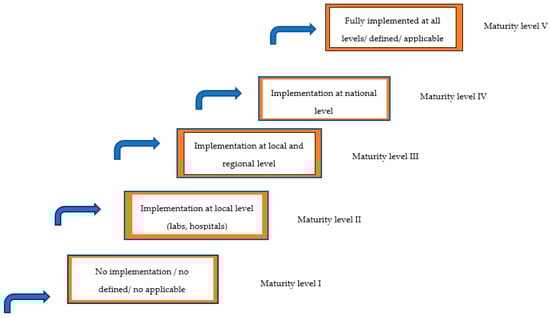 - Maturity level IV presents implementation at the national level with defined guidelines for the national level.