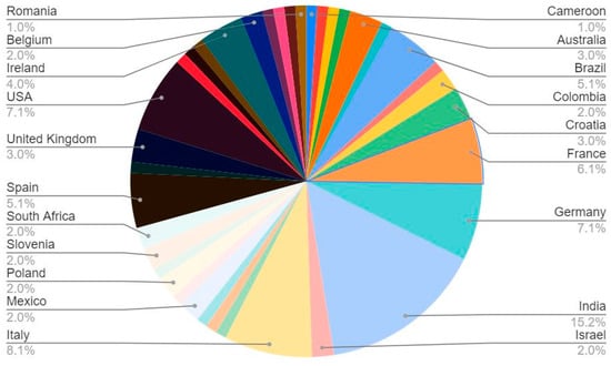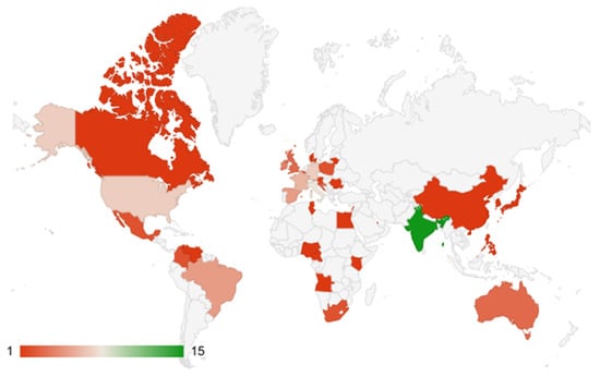 Countries involved in the survey shown on the map. Different colours indicate different representations of survey respondents. Red colour—low percentage; green colour—high percentage; total n of respondents was 99.