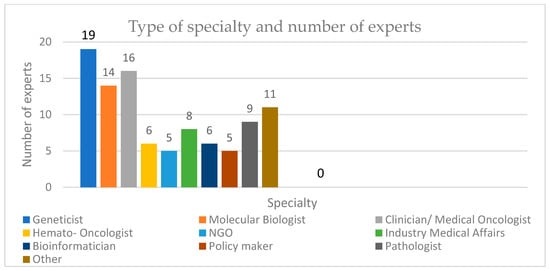 Ninety-nine respondents engaged in the NGS field across 37 countries participated in the survey. The largest percentage (15.2%) of respondents were from India; the involvement of experts from different centres, hospitals and universities can be seen in Figure 3 and Figure 4 (see also Appendix A, Table A3 and Table A8). Of these respondents, 16 were clinicians/medical oncologists, 14 were molecular biologists, 19 were geneticists, and others included bioinformaticians, haemato-oncologists, and industry representatives (Figure 5).