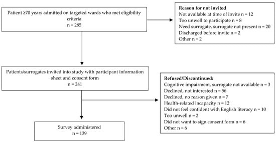 A total of 285 patients were potentially eligible, of which 241 (85%) were invited as the rest were either too unwell to participate, did not have a surrogate present, or were not on the ward at the time of recruitment (see Figure 1). Of the 241 invited, 139 people (60% of the expected sample size, 96% of patients, and 4% of patients with surrogates present) from the general medicine, respiratory, aged care, and oncology wards responded to the survey.