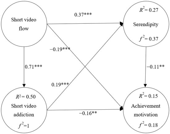 The explanatory power of short video flow with respect to short video addiction is 50% and f2 is 1. The explanatory power of short video flow and short video addiction with respect to serendipity is 27% and f2 is 0.37. The explanatory power of short video flow, short video addiction, and serendipity with respect to achievement motivation is 15% and f2 is 0.18, as shown in Figure 2.