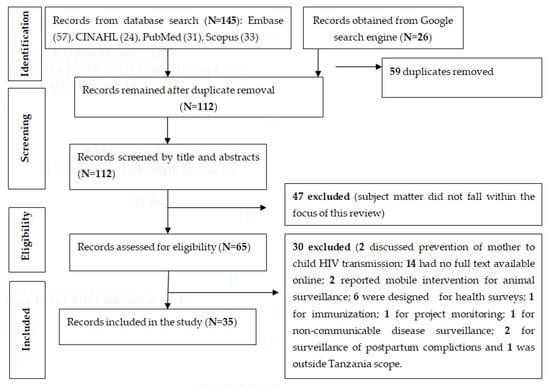 A search query was developed by combining key terms used to document the integration of digital technologies in health and terms representing infectious disease surveillance. The most commonly used concepts in the literature to describe the integration of computers and mobile devices in the health sector are eHealth, mHealth, telehealth, and telemedicine []. eHealth refers to the application of information and communication technologies in the health sector []. mHealth is the use of mobile devices, mainly mobile phones, for health purposes []. Telehealth is the use of mobile technologies to connect health professionals and their clients []. Telemedicine describes the usage of mobile devices by health professionals in consultations to solve patients problems []. Several other concepts are included in specific mHealth-related literature, such as short message service (SMS), smartphone/mobile applications (mobile apps), and interactive voice response (IVR/VRS) []. For infectious diseases, the main terminologies used are surveillance and public health surveillance []. Combined with Boolean operators, the following search query was used for database search: (Telemedicine OR mHealth OR “mobile Health” OR Telehealth OR “electronic* Health” OR eHealth OR Mobile, Health OR “cell phone*” OR “cellular phone*” OR “mobile phone*” OR text* OR “Short Message Service” OR message* OR SMS OR “Interactive Voice Response” OR IVR OR VRS OR smartphone* OR “mobile application” OR “mobile app*” AND (Surveillance* OR “Pubic health surveillance”) AND (Tanzania OR “United Republic of Tanzania” OR Zanzibar) Filters: from 2012/1/1/to 2022/11/28).