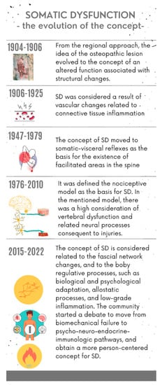 Somatic dysfunction (SD) is a key element of osteopathic practice [1]. SD was originally mentioned as osteopathic lesion (OL) by A.T. Still, the first osteopath [1]. The term OL was dismissed and changed to SD in 1968 by a working group of the Educational Council on Osteopathic Principles (ECOP), led by Ira Rumney and Norm Larson [1]. The Hospital Assistance Committee of the Academy of Applied Osteopathy, chaired by Ira Rumney, DO, developed definitions for osteopathic diagnosis and treatment, including SD, for inclusion in the Hospital International Classification of Disease (ICD) [1]. To date, SD is still listed in the present version of the ICD [2]. From being considered a milestone of early osteopathic regional anatomical approaches to the person, it has come to be viewed as body regulative function activity impairments related to the body framework, a region, or a generalized body schema that involves the whole organism, resulting in the “environmental lesion”, or “total lesion”, and “greater osteopathic lesion complex” [1]. During the evolution of the concept, SD was considered to have developed as a result of vascular changes related to connective tissue inflammation; or as a result of somatic-visceral reflexes as the basis for the existence of facilitated areas in the spine, representing the starting point of the nociceptive model [1]. A following mechanistic spine-centric model of health and disease impressed a huge portion of the community of practice [3], resulting in the adoption of a misinterpretation of the original concept of somatic dysfunction. Finally, osteopaths recovered the concept of the connective tissue framework, named fascial network, as a substrate related to biological and psychological adaptation, allostatic processes [3], and low-grade inflammation [4]. Consequently, the osteopathic community started a debate to move from biomechanical failure to psycho-neuro-endocrine-immunologic pathways and obtain a more person-centred concept for SD [5]. The Glossary of Osteopathic Terminology defines SD as an “Impaired or altered function of related components of the body framework system: skeletal, arthrodial and myofascial structures, and their related vascular, lymphatic and neural elements. It is characterized by positional asymmetry, restricted range of motion, tissue texture abnormalities, and/or tenderness” [6]. The latter listed parameters fall under the acronym of TART and have been referred to as the “diagnostic criteria” for SD. The evolution of the somatic dysfunction concept is summarized in Figure 1. Nowadays, on the one hand, a part of the community of practice is asking to dismiss the concept [7]. On the other hand, another part of the community proposes a reconceptualization of SD, considering the clinical entity as a pivot point that could favour the establishment of meaningful connections with the patient by using the body and the associated regulative biological and psychological functions [8] (see Supplementary Materials. Table S1: Somatic dysfunction, historical overview).