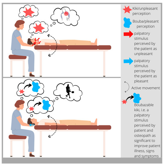 From a clinical practice standpoint, we propose to use the neuroaesthetics paradigm to guide the palpation process. The aim of osteopathic palpatory evaluation, in this case, is to find anatomical areas that “feel like Kiki”. There is no fixed way to define what the tissue should feel like; bogginess, thickness, ropiness, stringiness, firmness, and any changes in temperature and moisture are all possible palpatory findings. However, from a neuroaesthetics point of view, the focus is not the palpatory feeling itself, but rather the sensation evoked while the osteopath palpates in terms of “I like it vs. I do not like it”. A fundamental aspect of “finding Kiki” is that it is a process which involves the patient. It is fundamental that “Kiki” is recognized as Kiki by the patient and not only by the osteopath. It might happen that what feels like “Kiki” for the osteopath feels like a good kind of “Kiki” for the patient. This situation is often described by patients as “a good pain” or “it hurts but I am feeling that it does the job!” [32]. That opens up a window of possibilities for the treatment where the Kiki spot is possibly Boubazable. According to Kim and colleagues [32], attention-based strategies, such as mindfulness-based interventions, might lessen pain management. This leads to seemingly incongruent findings about attention and pain. The main somatosensory cortex and goal-directed attention areas in the prefrontal and parietal cortex mediate the analgesic benefits of attending to painful stimuli. These results provide evidence that pain itself can be employed as a component of pain management by pointing to top-down regulation as the main mechanism of the analgesic effects of paying attention to painful stimuli [32]. The fact that patients have an active role in attributing significance to a palpatory finding helps in foraging their body awareness (which is one of the indicators that patients monitor to determine the effectiveness of an osteopathic treatment according to a recent article [16]). Moreover, some authors [33] have hypothesized a relationship between body awareness and autonomic homeostatic processing. Indeed, the main subcortical neural substrates for these processes are limbic-related systems.
