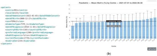 (a) A representative example of de-identified data based on a subset of the ADDN schema. (b) A screenshot of the HbA1c section of the benchmarking report. “P-“ indicates a paediatric centre.
