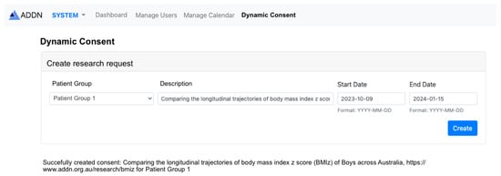 The ADDN Study Group regularly receives requests from researchers that wish to access and use the ADDN data for research purposes. These requests are assessed and accepted or rejected depending on a range of factors, e.g., they might be rejected if there are insufficient data on the topic of research interest, or they may be rejected if there is a perceived risk to the patients that are involved, or indeed if the science is flawed or repeats existing work. Assuming that a research request is approved by the ADDN Study Group, the ADDN registry includes the details of the study. Figure 3 shows an example of a research request focused on “Comparing the longitudinal trajectories of body mass index z score (BMIz) of boys across Australia, https://www.addn.org.au/research/bmiz” created by an authorised administrator in the ADDN registry. All individuals in the ADDN registry who in principle meet the criteria for the study need to be notified through the mobile application. In this case, the study focuses explicitly on Australian, male patients 0–12 years of age. The server generates notifications that are sent to those patients who have the app installed and who meet the criteria for the study. A timeline for consenting/declining to be involved as well as a link for the study details are provided. This includes the layperson’s patient information sheets for the study and the more detailed scientific background to the study that is submitted to the ADDN Study Group.