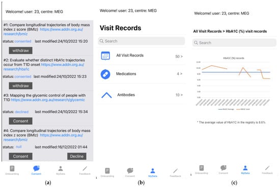 Screenshots of the ADDN Consent application. (a) Dynamic consent tasks. (b) Patient view of their data. (c) Patient view of their HbA1C data in visit records.