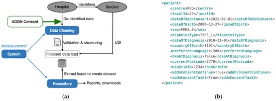 (a) Architecture of ADDN registry and data pipelines []. (b) An example of patient data with a merged opt-in consent result.