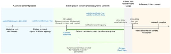 - Sub-project consent process: as described in Section 3.2, in this example, two research requests are approved by the ADDN Study Group on 09/10/2023 and 20/10/2023. The ADDN registry administrator creates a view of the data for the patients that match the study criteria, e.g., 0–12 year-old boys, and subsequently creates a dynamic consent task #3 and #4 for these research projects. A notification is then sent to the target patient group’s mobile app. From this point, notifications are pushed to patients’ phones periodically until they make a decision (consent, decline, withdraw). Patients are allowed to modify their decision any time before the cut-off date—given here as 15/01/2024, when the next data load begins, and the centres start to send the updated data to ADDN.