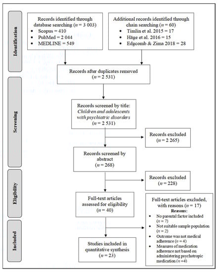 In total, 3006 articles pertaining to both parental factors and medication adherence factors among children and adolescents with psychiatric disorders were identified from three databases: Scopus (413), PubMed (2044), MEDLINE (549), and chain searching (60). Then, a total of 2531 unduplicated articles were further screened through title and abstracts. Specifically, 532 articles were duplicates and 2265 articles were irrelevant. The remaining 40 eligible articles, after title and abstract screening, were reviewed in their entirety, resulting in the further removal of 17 articles that failed to meet all necessary criteria: parental factors were not thoroughly discussed [52,53,54,55,56,57,58]; target population was not the child or adolescent population with psychiatric disorders [59,60]; outcome measures were not focused on medical adherence [61,62,63,64]; and medication adherence was not measured based on administering psychotropic medications [65,66,67,68]. Finally, only 23 articles were included in this review.