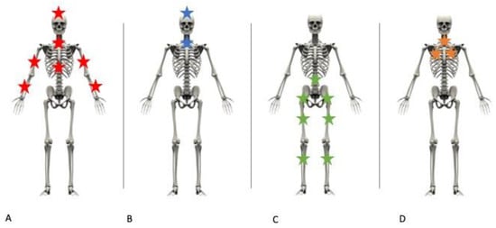 Lesions’ distribution in case of falls onto the head with (A) and without (B) defense attempt, falls on to the feet (C) and in our case (D).
