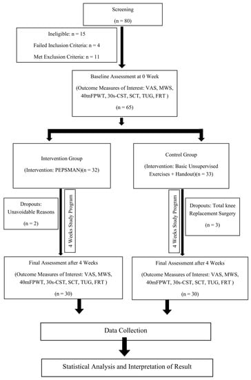 Out of 65 subjects recruited in the preliminary study, three patients from the control group dropped out for a total knee replacement procedure during the study, the intervention group experienced two dropouts due to unavoidable reasons, hence a total of 30 subjects in each control and intervention group completed the study program. The characteristics of the subjects are described in Table 2. The flow of the participants during the study is represented in Figure 1.