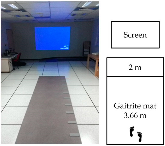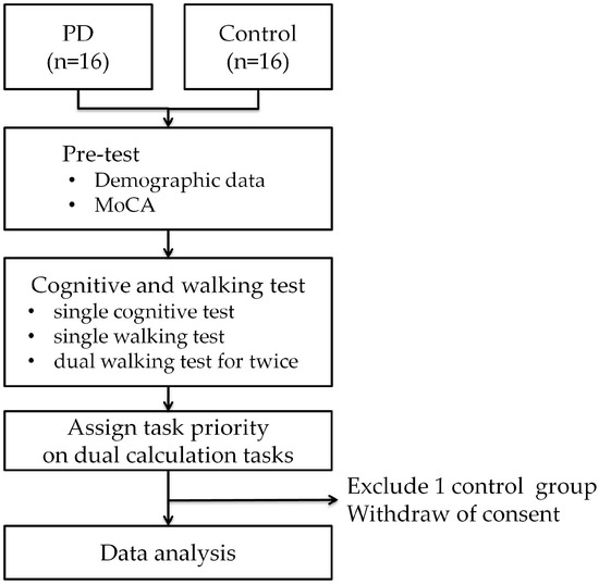 This study is a case-control study. Participants were 16 patients with PD (PD group) and 16 healthy subjects (control group). One subject in the control group withdrew due to personal reasons. Patients with Parkinson’s were recruited from the Department of Neurology division at a medical center. Age-matched control subjects with an average age of 60.93 ± 2.87 were recruited from the community. Parkinson’s patients must meet the following admission and inclusion criteria: idiopathic Parkinson’s disease with Hoehn and Yahr stage (H&Y) 1–3 (mild to moderate unilateral or bilateral disease; some postural instability; physically independent) levels diagnosed according to the United Kingdom Brain Bank Criteria. All PD participants had the postural instability gait difficulty (PIGD) motor subtype, without freezing of gait and with stable medication usage. Stable medication usage refers to no medication dosage changes three months before enrolling in the study and during the test period. Patients had physical/mental adaptations with effective maintenance by medication without symptom progress. Eligibility for inclusion was assessed by a neurologist. Subjects in both groups must be able to walk at least six meters indoors without using assistive devices and score at least 26 in Montreal Cognitive Assessment (MoCA) to avoid the influence of mild cognitive impairment [36,37]. The excluded conditions for both groups are: diagnosis of central nervous system diseases other than Parkinson’s disease, cardiopulmonary vascular disease, orthopedic disease, audiovisual sensory disease, symptoms of dementia, dyskinesia, or receiving deep brain stimulation. Subjects in the PD group were tested clinically “on” medication state. The single and dual task evaluations were performed by trained research team members who are licensed physical/occupational therapists. Patients and assessors were blind to the purpose of the study. Only the patients’ name and age were known prior to the subject’s evaluation; details were unknown. This study was approved by the Institutional Review Board and informed consent was obtained.