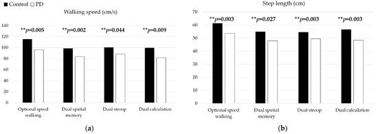 In Figure 3, the Mann–Whitney U test showed that the walking speed of the Parkinson’s disease group was significantly lower than the control group in the single walking task (p = 0.005), dual spatial memory task (p = 0.002), dual Stroop Task (p = 0.044), and dual calculation task (p = 0.009).