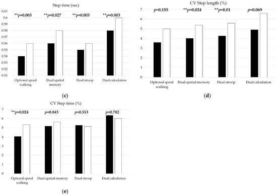 In the CV of step length, the PD group showed greater CV than the control group in only the dual walking with spatial memory task (p = 0.024) and Stroop task (p = 0.010), showing no difference in the single walking task (p = 0.155).