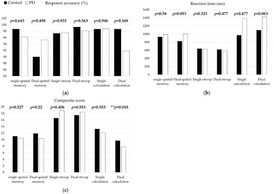 The cognitive performance includes (a) Response accuracy, (b) Reaction time, and (c) composite score, under the group single and dual tasks between healthy and PD group. ** p < 0.05.
