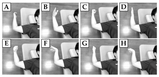 Participants were supine on the bed, with the shoulder joint in 90° abduction, the elbow joint in 90° flexion, and the forearm in a neutral position. Participants’ arm positions were verified using a goniometer. Furthermore, the arm to be measured was moved away from the edge of the bed and gravity stress due to the weight of the forearm was applied to the elbow joint to evaluate the parameters of the medial elbow joint. Gravity stress used in this study has been used in many previous studies [,,,,], and has been reported to be as useful as the Telos device in evaluating the medial elbow joint width []. From its designated position, participants performed resting and seven selective contractions of forearm muscles (Figure 1): (1) resting, (2) wrist ulnar flexion (contraction of flexor carpi ulnaris [FCU]), (3) finger flexion (contraction of flexor digitorum superficialis [FDS]), (4) forearm pronation (contraction of pronator teres [PT]), (5) wrist ulnar flexion and finger flexion (contraction of FCU and FDS), (6) wrist ulnar flexion and forearm pronation (contraction of FCU and PT), (7) finger flexion and forearm pronation (contraction of FDS and PT), (8) wrist ulnar flexion, finger flexion, and forearm pronation (contraction of FCU, FDS, and PT). Participants were asked to perform each muscle contraction task with the maximum voluntary contraction. Each of the seven muscle contraction tasks (other than resting) was performed 3 times at maximum effort for 5 s, and ultrasound measurements were taken during contraction each time. The order of these tasks was randomized. None of the participants had difficulty performing these contraction tasks due to pain or fatigue.