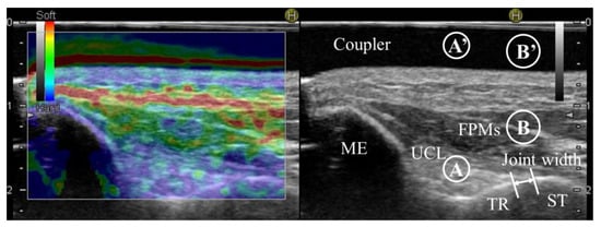 Evaluation of ultrasound images. The elastography image on the left is colored for each tissue hardness (red, soft; yellow to green, medium; blue, hard). The image on the right is a B-mode image. ME, medial epicondyle of humerus; TR, trochlea of humerus; ST, sublime tubercle of ulna; UCL, ulnar collateral ligament; FPMs, forearm flexor–pronator muscles; Coupler, coupler region; Joint width, ulnohumeral joint width; Circle A, target region of UCL; Circle A’, reference region of UCL (just above the UCL’s target region); Circle B, target region of FPMs; Circle B’, reference region of FPMs (just above the FPMs’ target region).