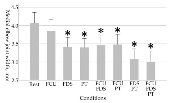For the medial elbow joint width, a main effect of the tasks was observed (p < 0.001). Medial elbow joint width during tasks other than “FCU alone contractions” were significantly reduced compared to the resting condition (Rest, 4.07 ± 0.65; FDS, 3.42 ± 0.58, p = 0.008; PT, 3.40 ± 0.55, p = 0.006; FCU and FDS, 3.46 ± 0.63, p = 0.017; FCU and PT, 3.48 ± 0.63, p = 0.022; FDS and PT, 3.08 ± 0.63, p < 0.001; FCU, FDS, and PT, 3.00 ± 0.68, p < 0.001).