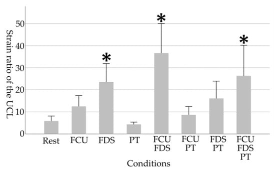 Changes in UCL due to selective contraction of the FPMs. A higher value in strain ratio indicates harder (stiffer) tissue. Asterisks indicate significant differences compared to the resting condition (p < 0.05). Error bars in the graph are standard errors. UCL, ulnar collateral ligament; FCU, flexor carpi ulnaris; FDS, flexor digitorum superficialis; PT, pronator teres.