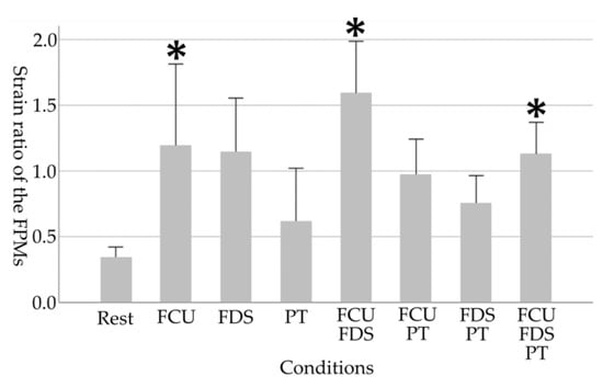 Changes in FPMs due to selective contraction of the FPMs. A higher value in strain ratio indicates harder (stiffer) tissue. Asterisks indicate significant differences compared to the resting condition (p < 0.05). Error bars in the graph are standard errors. FPMs, forearm flexor–pronator muscles; FCU, flexor carpi ulnaris; FDS, flexor digitorum superficialis; PT, pronator teres.
