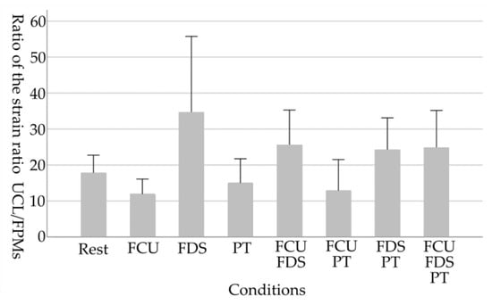 For the ratio of the strain ratio UCL/FPMs, a main effect of the tasks was observed (p = 0.013). There was no significant difference between the resting condition and each contraction task (All p > 0.05). However, contraction tasks including FDS tended to increase compared to the resting condition, but “FCU”, “PT”, and “FCU and PT” tended to decrease compared to the resting condition.
