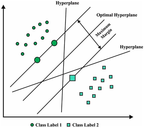 For PCa detection, the LS-SVM model is used. The LS-SVM is a well-organized ML algorithm that functions on the basis of statistical learning approach developed by Vapnik. The LSSVM algorithm effectively overcomes the higher-dimensional nonlinear and local minimal problems [28]. It can be established in a SVM method with two other features. Initially, inequality is constrained by the equality constraints after which it transmits two programming problems to the linear expression. These additional features accelerate the computational time of the LSSVM on the SVM method. Figure 2 demonstrates the structure of the SVM hyperplane.