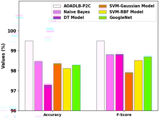 Figure 9 illustrate the and analytical outcomes accomplished by the proposed AOADLB-P2C methodology and other existing approaches. The outcomes show that the AOADLB-P2C approach exhibits a superior performance over other techniques. In terms of , the proposed AOADLB-P2C methodology attains a maximum of 99.50%, while the NB, DT, SVM-Gaussian, SVM-RBF, and GoogleNet methods attain lower values of 98.47%, 97.26%, 98.43%, 98.63%, and 98.28%, respectively. Likewise, in terms of , the AOADLB-P2C technique attains a maximum of 99.50%, whereas the NB, DT, SVM-Gaussian, SVM-RBF, and GoogleNet approaches attain lower values of 98.641%, 98.47%, 98.54%, 97.89%, and 98.49%, respectively.