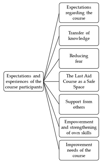 Therefore, the results are clustered and presented as follows: expectations regarding the course, transfer of knowledge, reducing fear, Last Aid courses as a safe space, support from others, empowerment and strengthening of own skills, and improvement needs of the course. For a better overview of the topics, see the following figure (Figure 1).