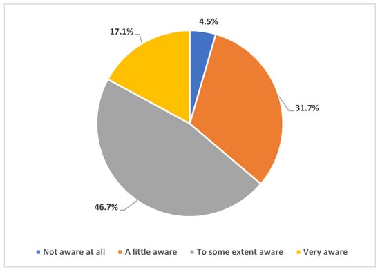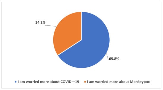 To explore our participants’ knowledge of monkeypox disease, we assessed their awareness of the recent outbreaks of the disease worldwide. As shown in Figure 1, 46.7% indicated they are to some extent aware, while 31.7% were just a little aware, and only 17.1% very aware. Figure 2 dissects the participants’ worries about Mpox disease as compared to COVID-19. The majority (65.8%) were more worried about COVID-19.