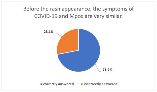| Before the rash appears, the symptoms of COVID-19 7 and Mpox are very similar | True | 95 (47.7) | 104 (52.3) |