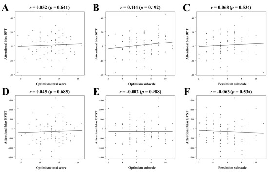 Correlation between optimism and attentional biases. Correlation between attentional bias derived from the DPT and optimism total score (A), optimism subscale score (B), and pessimism subscale score (C). Correlation between attentional bias derived from the EVST and optimism total score (D), optimism subscale score (E), and pessimism subscale score (F). DPT, dot-probe task; EVST, emotional visual search task.
