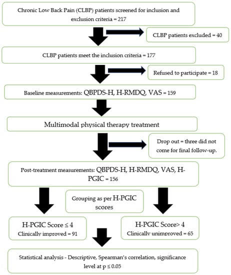 The participants’ progression in the study is explained in Figure 1. Patients with CLBP were screened for inclusion and exclusion criteria and among 217 screened patients, 177 patients met the required inclusion criteria, and 40 were excluded. Among 40 excluded patients, 23 had history of radiating pain, 12 had previous history of spine trauma/surgery, 2 were unable to walk 100 m, and 3 were not willing to complete the questionnaires. Out of those patients who met inclusion criteria, only 159 agreed to participate, and in the end, 156 completed the final responses and were used for the data analysis. The patients were divided based on the final H-PGIC scores into two groups: “clinically unimproved (≤4 scores)” (n = 65; 41.7%) and “clinically improved (>4 scores)” ones (n = 91; 58.3%).