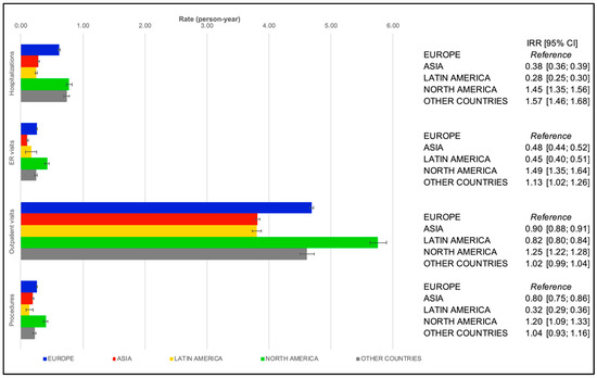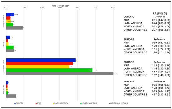 AF-related HCRU was reported as the percentage of patients having at least one event included in the analyses and quantified as rate-per-patient-per-year (PPPY). Region-specific HCRU rates were subsequently compared using a Poisson regression model, which was adjusted for possible known confounders and modifiers collected in the registry, such as sex, age at enrolment, type of AF (i.e., (i) paroxysmal: AF that lasts less than 7 days and resolves spontaneously or with intervention; (ii) persistent: AF episode that continues for more than 7 days, irrespective of whether the episode was terminated by cardioversion or if it self-terminated; (iii) permanent: when AF is accepted by the patient (and physician) and a rate-control strategy is needed; or (iv) new onset—unclassified), AF therapy (i.e., antiplatelet [AP], alone or in combination with Vitamin K antagonists [VKA] or NOAC), comorbidities, prior transient ischemic attack, prior bleeding, CHA2DS2-VASc score, country income level (i.e., high, upper-middle, or lower-middle), and healthcare system payer (i.e., single payer, universal public insurance, public-private insurance, or private insurance). Results are expressed as incidence rate ratios (IRR) with 95% confidence intervals (95% CI). All p-values were two-sided, with values <0.05 considered statistically significant. Analyses were performed using STATA statistical software version 13.1 [19].