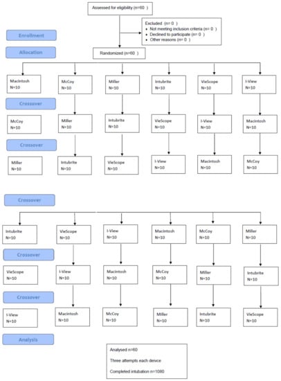 Each participant used all devices in random order in a crossover arrangement. The order in which the laryngoscopes were used was randomized using sealed opaque envelopes. The locked randomization strategy was generated using the Randomizer Program (randomizer.org). Flow diagram is presented in Figure 1.