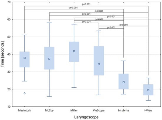 There were significant differences between the mean time of intubation with the usage of the aforementioned laryngoscopes (p < 0.001). The statistically significant results of the performed post hoc Dunn’s test are shown in Figure 3.