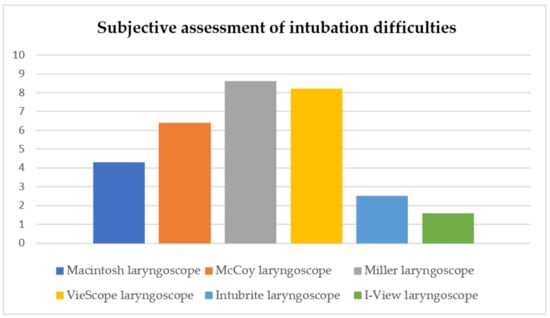 In our study, the successful first, second, and third intubation rates with the Miller laryngoscope were 73.3%, 66.7%, and 70%, respectively. There was no statistically significant reduction in intubation time between successive intubation attempts. It also turned out to be the most difficult laryngoscope to use among our subjects. Such a distant position of this laryngoscope in our list is probably due to the fact that the need to maintain a straight line between the subject’s eye and the entrance to the airway in the case of intubation of a manikin lying at the floor level requires adopting the least comfortable position of the body. The lack of or little possibility of lifting the epiglottis when using this laryngoscope also affects the effort of the professional. Vidhya came to different conclusions, believing that the Miller’s laryngoscope enables much better visualization of the larynx than the McCoy and Macintosh laryngoscope, even in patients with difficult airways [31]. Similarly, Achen claimed that Miller’s laryngoscope enabled better visualization of the airway entrance than the Macintosh laryngoscope, and therefore everyone should learn laryngoscopy using both laryngoscopes [32]. This is important because, according to other authors, although the view of the glottis was better with the Miller laryngoscope than with the Macintosh laryngoscope, intubation conditions turned out to be better with the Macintosh laryngoscope [33,34]. The Miller laryngoscope was superior to the Macintosh and McCoy laryngoscope for visualizing the glottis in children [35,36].