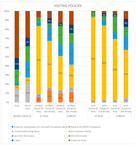Nevertheless, many ICUs reported more liberal policies for particular cases, such as end-of-life and clinical deterioration, showing that the emotion and value of staying at the bedside of a sick relative, communication with relatives, and setting goals of care ensuring dignity in death and decision-making power [16] were recognized by healthcare providers as a valid trigger for modification of policy, even in the context of the pandemic. Another striking finding was that the need for a drastic and rapid reorganization prevented the structured and fast implementation of communication methods. Most Italian respondents declared not having any dedicated COVID-19 information booklet or webpage for visitors of ICU patients, and that the telephone remained often the main and only means of communication, with virtual visiting most often conducted upon request from the relatives. Concordantly, data from Italy and other countries showed that videocalls and virtual visiting became a usual means of communication during pandemic restrictions [13,17,18]. Our data confirm that the COVID-19 pandemic has been a challenge for modern healthcare systems, not only because of the need for advanced life-sustaining treatments in intensive care units, often with an imbalance between resources and needs, but also due to the huge impact on communication and visiting policies and to the potentially distressing impact these issues have had on many people. It is indeed known that not saying goodbye to a dying relative may be associated with increased psychological burden [19] and symptoms of PTSD in family members of ICU patients with COVID-19 [12], and growing evidence has shown associations between visit restrictions and detrimental effect on patients’ health, the health and wellbeing of family members, and the provision of care [20] in most settings of care, including the ICU [21].