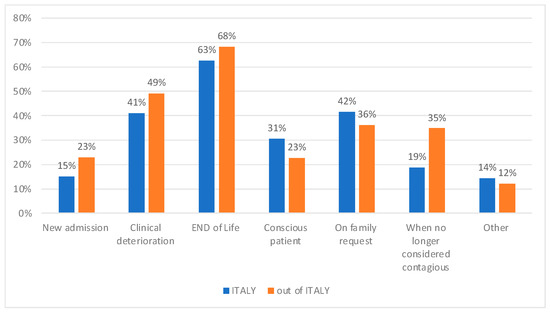 Visiting policies applied the same rules for all the hospital wards in most of the cases (52%) in Italy, and 42% outside of Italy. Despite that, ICU visiting policies could be, even temporarily, changed for specific patients or situations, on the basis of decision by the ICU medical director (63% in Italy; 40% outside of Italy), doctors (33% in Italy; 48% outside of Italy), or the ICU nursing director (17% in Italy; 17% outside Italy). Indeed, most of the respondents (87% in Italy and 82% outside of Italy) declared that a more liberal policy was offered to relatives of ICU patients, allowing them to stay at the bedside more often or for longer periods, and that this occurred in cases of clinical deterioration and end of life, followed by family request (Figure 2).