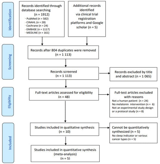Overall, 1917 records were identified by database searches. After the removal of 804 duplicates, a further 1065 articles were excluded by title and abstract on the basis of the selection criteria. Subsequently, the full text of 48 articles were assessed. Among them, 38 irrelevant records were additionally excluded for the following reasons: not a human study, no melatonin intervention, or not an experimental study. Ten documents were analyzed for the context of melatonin intervention studies in breast cancer patients [19,20,21,22,23,24,25,26,27,28] with qualitative methods. Among these 10 melatonin intervention studies, several articles were excluded from the meta-analysis because they did not measure outcomes related to sleep or because their study population included various cancer types. Eventually, five studies were included in the meta-analysis [19,20,21,22,23] (Figure 1). In some studies, adverse effects were reported in a qualitative manner, but could not be evaluated by meta-analysis since most studies did not report adverse effects.