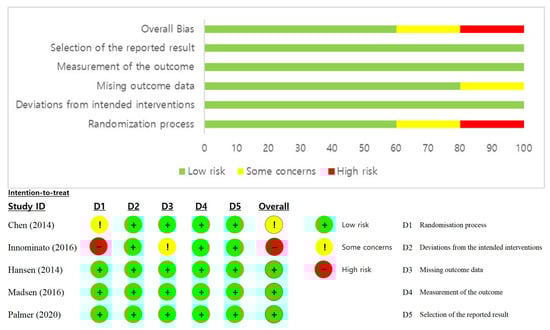 The included studies were subjected to a risk-of-bias assessment to create a quantitative synthesis of the effects of sleep improvement. Risk-of-bias assessment was performed using the Cochrane risk-of-bias tool for randomized trials, “https://www.riskofbias.info/welcome/rob-2-0-tool/current-version-of-rob-2 (accessed on 29 June 2022) [17]”. The risk-of-bias was evaluated based on five criteria: the randomization process, deviations from the intended interventions, missing outcome data, measurement of the outcome, and selection of the reported result. Two evaluators worked independently to complete the evaluation after reading the original articles. The final appraisal findings were decided by discussions if there was a discrepancy in the evaluators’ scores.
