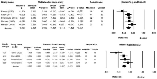 Five studies included sleep-related variable as an outcome. The total number of participants included in the analysis was 243. The estimated average effect size (Hedges’ g) was −0.79 (p < 0.001) in a random-effects model, which was −0.79 SD of breast cancer patients who took melatonin supplements. This means that there was a difference of 7.9 points out of 10 points, thus indicating a moderate average effect size. The 95% confidence interval of the effect size was −1.16 to −0.41 (Figure 3). This result showed that when melatonin was provided, the sleep quality of breast cancer patients improved on average, and the effect might be very strong, moderate, or insignificant depending on the sample. Given that the confidence interval did not contain a zero, the null hypothesis that the effect size was zero (Z = −4.13) was dismissed. Thus, compared with placebo, melatonin supplementation in patients diagnosed with breast cancer had positive effects in terms of improved sleep quality.