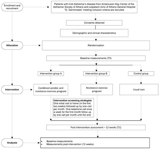 Dementia causes deterioration in cognitive and physical functions. The scope of this study is to investigate the effect of different exercise programs on cognitive functions and functionality of persons suffering from mild Alzheimer’s disease (AD) by generating information on the exercise types and their parameters. A randomized controlled trial (RCT) will be performed involving aerobic and resistance exercise interventions, taking place both at the sample collection center and at home. Participants will be randomly divided into two different intervention groups and a control group. All groups will be assessed twice; once at baseline and once after 12 weeks. The primary outcome shall comprise the effect of exercise programs on cognitive functions using cognitive testing, such as Addenbrooke’s Cognitive Examination—Revisited (ACE-R), Mini Mental State Examination (MMSE), Trail Making Test A-Β (TMT A-B), and Digit Span Test (DST): Digit Span Forward (DSF) and Digit Span Backward (DSB). The effect on functionality will be assessed using the Senior Fitness Test (SFT), Berg Balance Scale (BBS), and Instrumental Activities of Daily Living Scale (IADL) questionnaire. Secondary outcomes include the effect of exercise on depression using the Geriatric Depression Scale-15 (GDS-15), on physical activity using the International Physical Activity Questionnaire (IPAQ), as well as the participants’ compliance with the intervention. This study will investigate the possible effect of intervention of different exercise types and the comparison between them. Exercise forms a low-cost and reduced-risk intervention.