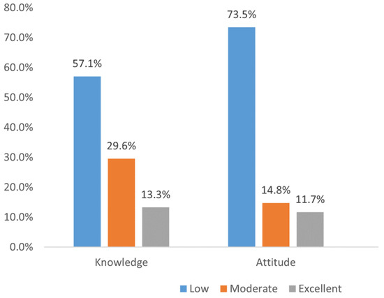 The knowledge section consisted of 12 questions in which a participant’s correct score was calculated as 1, and wrong/not sure were scored as 0 (the answer key to the correct/wrong scores were available for the principal investigators and coinvestigators, and it was entered accordingly for statistical analysis). The attitude section consisted of 9 questions in which a participant’s positive answer was calculated as 1, and a no/not sure/negative answer was scored as 0. The total scores were combined and converted to 100 percent. The knowledge and attitude percentages were subclassified into three categories: excellent (≥80% of possible score), moderate (60–79% of possible score), and low (<60% of possible scores). Furthermore, we combined low and medium categories as a single category. We compared them with the excellent category according to Bloom’s criteria, commonly used criteria to categorize the knowledge, attitude, and practice of the public for the health-related surveys [17,21].