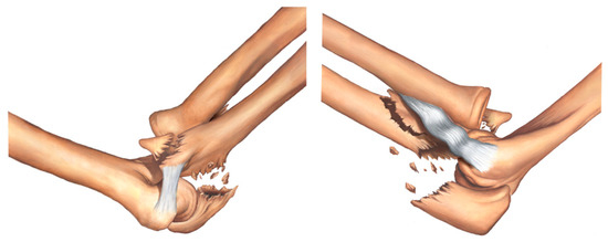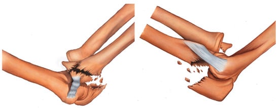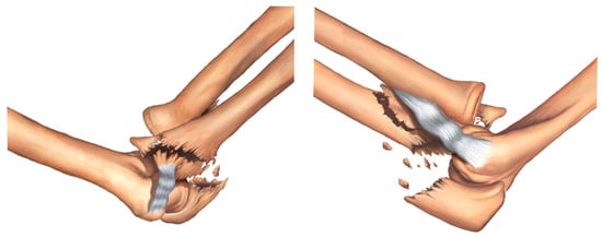 A recent improvement in imaging techniques and a better understanding of the biomechanical role of the main determinants of elbow stability have been crucial to changing this situation, allowing proper identification of all morphological characteristics of the proximal ulna [4,5,6,7,8,9,10,11,12,13,14]. On the medial side, the olecranon and coronoid process act as elbow stabilizers. In particular, the coronoid process, which functions as an important primary stabilizer of this joint, has two facets, separated by a ridge that runs along the greater sigmoid notch. While the anteromedial facet acts as a primary stabilizer, the anterolateral facet is a secondary stabilizer, sharing with the radial head the valgus stabilization of the elbow. In addition to these bony structures, the anterior bundle of the medial collateral ligament, which inserts into the sublime tubercle, is another fundamental stabilizer of the elbow joint on the medial side, resisting deforming forces in varus. Laterally, the radial head acts as a secondary restrictor to valgus deformation, so that the lateral ligament complex acts statically and dynamically to restrict valgus and varus forces. In addition, the lateral ulnar collateral ligament is of paramount importance in the posterior stability of the radial head. Finally, in the sagittal plane, both the olecranon and the triceps brachialis tendon and the coronoid process and anterior capsule of the elbow act as important restrictors of anterior and posterior translation of the ulna, respectively.