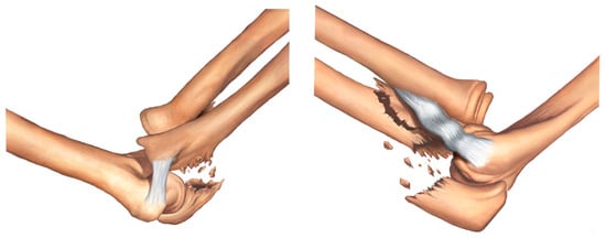 - Midtgaard, K.S.; Nolte, P.C.; Miles, J.W.; Tanghe, K.K.; Peebles, L.A.; Provencher, M.T.; Adolfsson, L. Biomechanical significance of the collateral ligaments in transolecranon fracture dislocations. J. Shoulder Elbow Surg. 2021, 30, 1245–1250. [Google Scholar] [CrossRef]