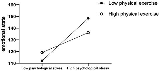 In this study, the moderating effect was tested with psychological stress as the independent variable, emotional state as the dependent variable, and physical exercise as the moderating variable. The results showed that psychological stress had a positive effect on the emotional state (B = 1.3, p < 0.01), indicating that as the level of psychological stress increased, their emotional state became more negative; physical exercise harmed emotional state (B = −0.06, p < 0.01), indicating that as physical activity increased, their emotional state became more positive; there was a negative moderation of the effect of physical activity on psychological stress on the emotional state (B = −0.012, p < 0.01, ∆R2 = 0.007). Simple slope: When physical exercise was low, psychological stress had a strong positive effect on negative emotional states, which was more likely to lead to negative emotional states (Table 3). When the level of physical exercise was higher, psychological stress had a lower positive effect on negative emotional states, indicating that the influence of psychological stress on negative emotional states was weakened (Figure 1).